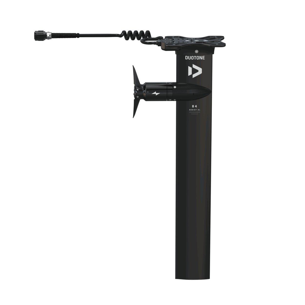 With a size of 84 cm, this mast is ideal for prone and downwind foiling and can also be used for wake foiling in tanker waves and wing foiling in light winds.The motor pod is seamlessly integrated into the mast profile, positioned 17 cm below the top plate. This integration not only enhances aesthetics but also contributes to performance. The mast features internally routed cables, ensuring optimal glide and maximum maneuverability. Its rigid, surf-inspired profile provides precise control and instant responsiveness while minimizing drag for smoother, more efficient sessions.Customize your ride with different propellers — plastic or aluminum — to dial in your perfect setup. Choose between powerful assistance that enables you to ride smaller foils and perform sharper turns, or go for a smoother boost for easy takeoffs and foiling. The folding gear propeller minimizes drag for effortless glide on the wave. Its integrated gear system allows the two-blade propeller to unfold instantly, delivering a seamless transition as you kick out of the wave and power back out.All components of the Foil Assist system are compatible with the other mast options, allowing you to easily expand your setup. With a wide selection of fuselage adapters — including, in addition to Duotone, ten other options such as F-One, Armstrong, Gong, Axis, Lift, North, Code, Sab, AFS, and KT — the Foil Assist can be seamlessly combined with most foil systems. It mounts to the board just like a traditional mast.To maximize battery runtime with your Foil Assist, we recommend using a front wing with a surface area of 900 cm2 or larger, along with a board that has a minimum volume of 35 L.Whether you're looking to enhance your sessions or push your performance, every detail of the Foil Assist Mast AL has been engineered for a seamless and intuitive assist experience in all conditions.The following items are included in the eMast AL Set:Foil Assist Mast AL including motor, bell, regular propeller blades, regular cable, and leashAssist eMast coverMotor bell & propeller coverScrew set and toolsCable fastener VSpare regular propeller bladesBattery bag